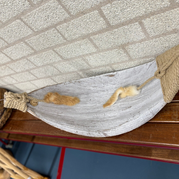 Elk blad wordt afgewerkt met 2 kanten henneptouw met daaraan speeltjes van bont.