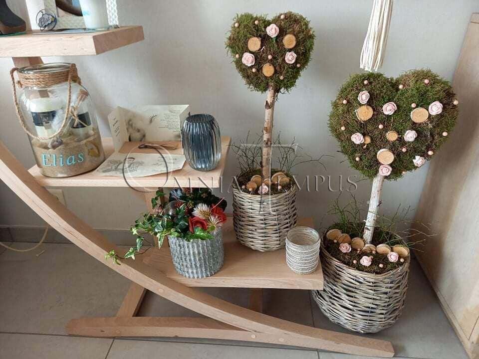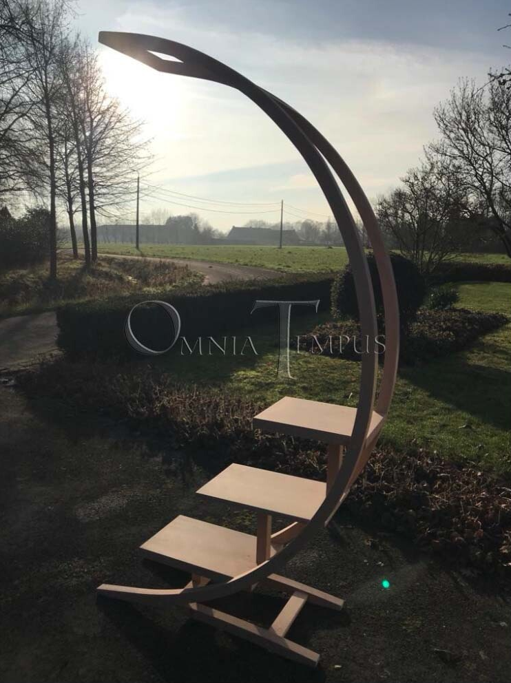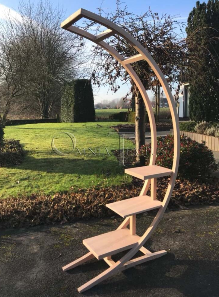Pracht van een gebogen plantenboom waar je planten kan aanhangen en ook plek voorzien is om te zetten.